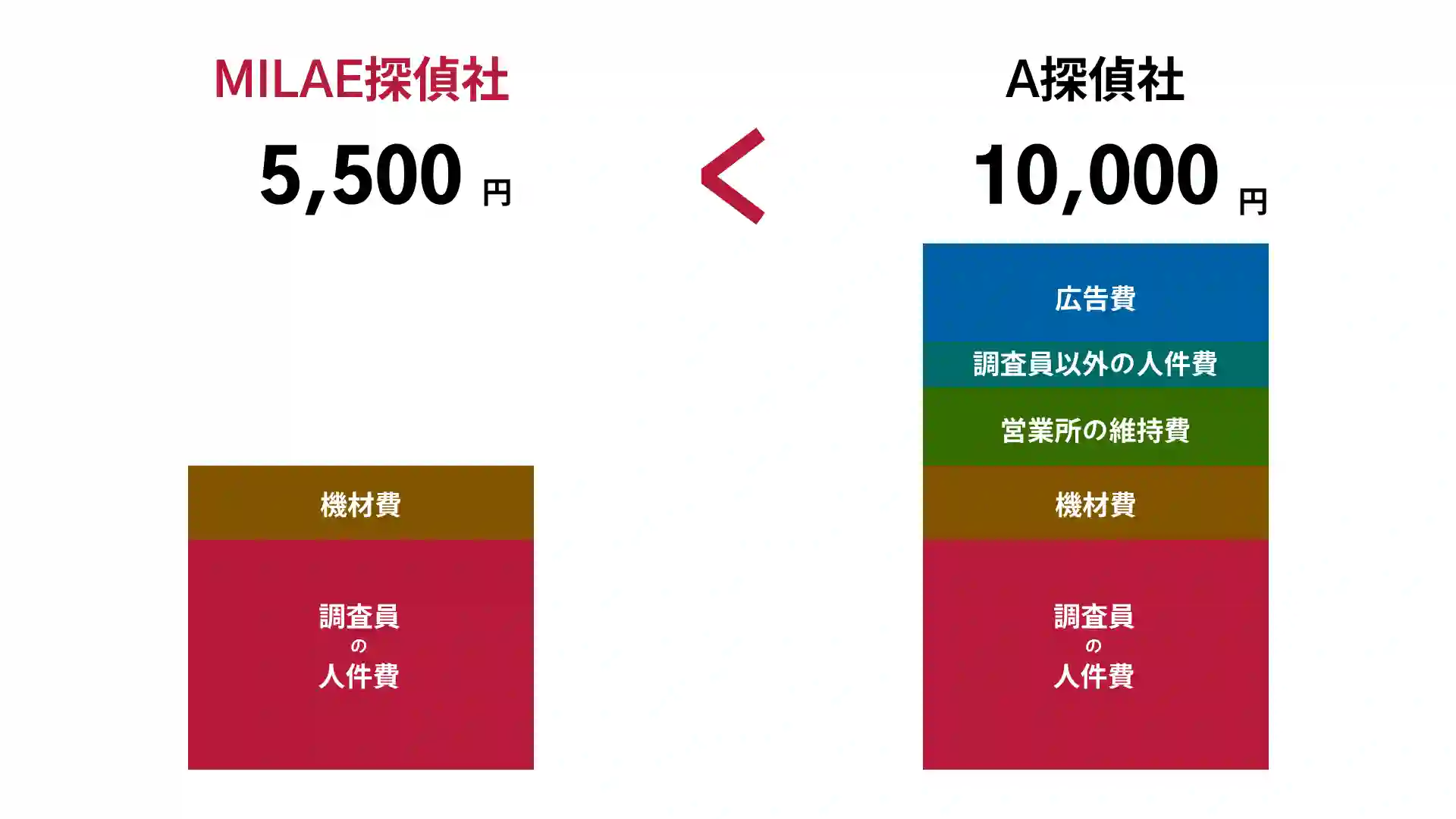 不要な経費を抑え、撮影機材と調査員の人件費のみにお金をかけているから実現できたこの価格。